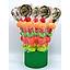 Cubo redondo con 12 brochetas fabricadas exclusivamente con golosinas y nubes.
