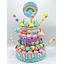 Tarta tamaño grande, distribuida en pisos y fabricada exclusivamente con golosinas y nubes.