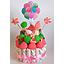 Tarta tamaño mediano, distribuida en pisos y fabricada exclusivamente con golosinas y nubes.